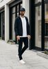 Conseil de taille Hessel mesure 1 mètre 88 et porte la taille 32/32. L'ajustement est Slim.